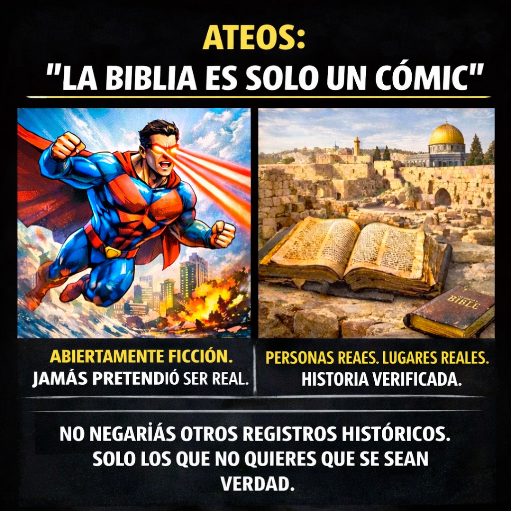 2. Se sabe que Superman no existe, no solo porque nunca lo hemos visto, sino también porque se sabe que solo son personajes imaginarios creados por los judíos Jerry Siegel y Joe Shuster en 1933, pero el personaje no debutó oficialmente hasta abril de 1938 en el número 1 de Action Comics. Lo mismo se puede decir de otros superhéroes creados por el legendario guionista, editor, productor de cómics y judío, Stan Lee (1922-2018). En cambio, a Jesús si lo vieron y por eso hay mucha evidencia histórica de que el Cristo resucitado sí existió. Por tanto, me pregunto si esta falsa analogía de comparar libros de fantasía con la Biblia también se aplica a Sócrates, Aristóteles y Platón, pues lo único que demuestra es que el ateo no sabe diferenciar entre personajes de ficción (Superman, Hulk, etc.) y una figura histórica (Jesús), el cual tiene más evidencias históricas que el mismo Alejandro Magno o Julio César. Además, la existencia de Jesús también es afirmada por reconocidos historiadores, incluyendo ateos y agnósticos, como H.G. Wells, Gerd Ludemann, Tim O’Neill, Will Durant y Bart Ehrman. Hasta el mismo Richard Dawkins quien antes negaba la existencia de Jesús dijo en un debate con el filósofo cristiano, John Lennox, “Me retracto de lo dicho, Jesús sí existió”. Como dice la Gran Enciclopedia Larousse “Los historiadores serios son unánimes al afirmar sin duda que Jesús existió realmente.” Gran Enciclopedia Larousse (Tomo 11, p 6699). Por tanto, todavía no entiendo la desesperación de algunos ateos de “debatir” la verdad histórica de Jesús. En fin y como dice Lee Strobel, “Negar la existencia de Jesús, simplemente no lo hará desaparecer de la historia.” (Lee Strobel, autor de “El Caso de Cristo”).