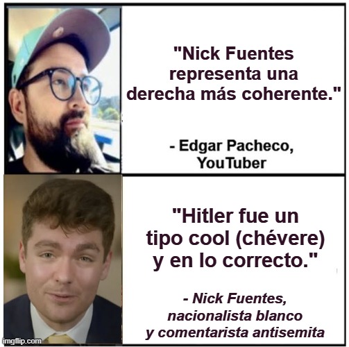 De los creadores de “Si no tomas alcohol eres afeminado y débil en la fe” ahora nos llega, “Nick Fuentes representa una derecha más coherente”. Pero, ¿quién es Nick Fuentes? Nick Fuentes es un supuesto “cristiano” con mucha influencia, pero ha sido removido de varias plataformas debido a que sus ideas son consideradas muy peligrosas, en especial para la juventud. No solo es un neonazi o antisemita declarado que se burla de las víctimas del Holocausto con su negacionismo extremo y celebra el cumpleaños de Adolfo Hitler, sino que ni siquiera le gustan los mexicanos como Edgar Pacheco a quienes describe como “arruina barrios” e “invasores” de los Estados Unidos. Fuentes también es un sensacionalista mal hablado que admira a dictadores como Stalin y tampoco le gustan los matrimonios interraciales. También ha defendido las acciones inmorales de Jeffrey Epstein, odia a las mujeres y asiste a bares gay. Quizás esto explica por qué el bloque gei de Pacheco se dan besitos en la nuca en sus fiestas. A pesar de tener un padre latino, Nick Fuentes niega su propia identidad étnica, se burla de su propia cultura y dice que “no es lo suficientemente blanco”. Afirma que los hispanos están destruyendo a América al emigrar a EE. UU. y que representan una amenaza demográfica. También promueve un nacionalismo católico de supremacía blanca que excluye a hispanos. Siguiendo esta lógica, Pacheco no debería estar en Estados Unidos. La realidad es que Nick Fuentes no es un verdadero cristiano que, al igual que Pacheco, se le conoce por su doble discurso o lenguaje.