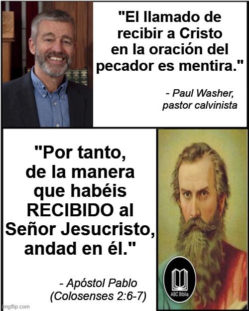 El pastor calvinista, Paul Washer hizo una cruzada contra la llamada “Oración del pecador” diciendo, “¿Dónde en la Biblia se evangeliza de esa manera?” y que Jesús no dijo que pidieran venir a sus corazones. Juan Manuel Vaz lo llama la oración del papagayo y lo mismo repiten otros calvinistas como Will Graham, Sugel Michelen y Miguel Nuñez quienes rechazan este uso o eficacia evangélica. Sin embargo, Paul Washer quien por cierto fue un total fracaso como misionero en Perú no es un referente espiritual ni académico. De hecho, Washer ignora que, aunque la frase, “Pedid a Jesús en vuestro corazón” no está en la Biblia hay muchas frases similares en ella como Colosenses 2:6 donde dice, “habéis recibido a Cristo Jesús el Señor…” y otros pasajes como Juan 1:12-13; Hechos 2:36-41 y Romanos 10:8-13 y Apocalipsis 3:20. De hecho, Efesios 3:16-17 enseña que para que Cristo more en nuestro corazón debemos tener fe cuando lo confesamos y lo recibimos. Todo esto son términos bíblicos.