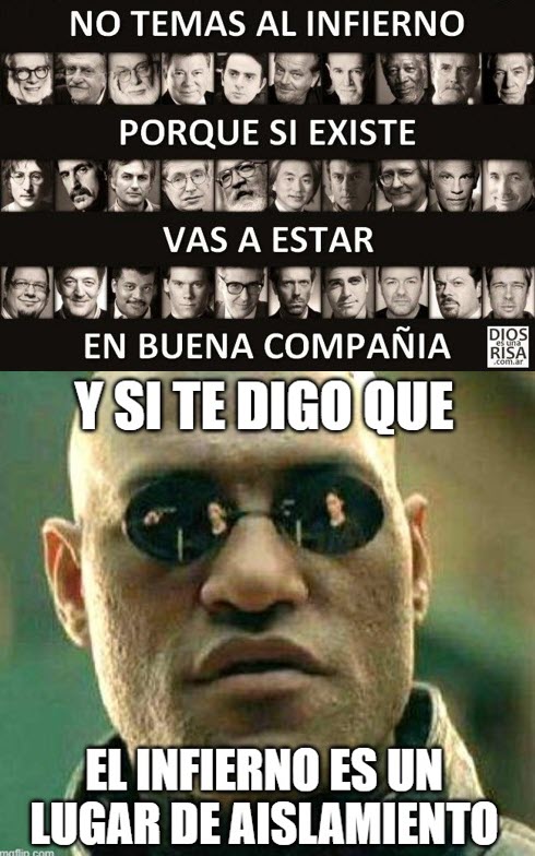 Muchos ateos anticristianos usan la expresión: “Mejor es estar en el infierno con amigos que en el cielo con hipócritas.” Pero olvidan que no habrá amigos en el infierno ni hipócritas en el cielo. Además, decir que una persona no debe temer ir al infierno de fuego porque allí también estará alguien popular es tan estúpido como decir que no deberíamos temer morir en un edificio en llamas si allí también hay gente popular quemándose. Otra cosa, ¿qué les hace pensar a estos tontos que todas las celebridades que admiran querrán acompañarlos en un tormento eterno? Sin olvidar que muchas de las personas que aparecen en sus memes todavía están vivas y que algunos ni siquiera son ateos sino creyentes o agnósticos. No solo eso: ¡siempre se les olvida poner a todos los violadores, pedófilos (como Jeffrey Epstein y David Thorstad, fundador del grupo pro pederasta NAMBLA), asesinos, criminales y terroristas (sean ateos o creyentes), a Satanás y sus demonios, quienes también les harán “buena” compañía! De todas formas, se pueden mencionar al menos tres problemas en este tipo de memes. El primero es que la mayoría de las personas famosas que aparecen en sus imágenes no son grandes filósofos ni científicos, sino solo comediantes (payasos) o celebridades de Pedowood (digo, Hollywood). El segundo es que el infierno es todo lo opuesto a lo que es de Dios, lo que implica lo siguiente: Dios es luz; el infierno es oscuridad. Dios es comunión; el infierno es aislamiento. Dios es la fuente suprema de toda belleza y felicidad; el infierno es sufrimiento, tormento y fealdad. Por tanto, se equivocan quienes creen que el infierno será una reunión de amigos en la que estarán en buena compañía, puesto que el infierno no solo es descrito biblicamente como un lugar oscuro donde ni siquiera podrán ver a sus ídolos (Mateo 25:30) sino también como un estado de completo aislamiento, separado de Dios y de los demás (Vea Lucas 16:19-31). Y por último, deberían sacar a varias de esas figuras de su lista, pues solo son ateos en su imaginación. ¿Ignorancia o mitomanía?
