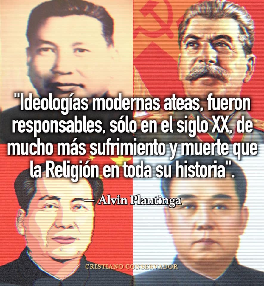 En fin, es sabido por todos que los regímenes comunistas estaban ligados intrínsicamente al ateísmo y el anticristianismo, por lo que si algún ateo se siente libre de argüir que la Inquisición mataba a los “heréticos” por motivos ideológicos, entonces se puede argüir que los sistemas comunistas, amparados en el discurso ateo y anticlerical, también mataban por “motivos religiosos”. Lo mismo se puede decir del dictador antirreligioso Mussolini, la revolución anticlerical francesa (1789-94) que causó más muertes en un mes en el nombre del ateísmo que la Inquisición a lo largo de la Edad Media en Europa y las actuales persecuciones a los cristianos en China y Corea del Norte. En palabras del reconocido filósofo cristiano, Alvin Plantinga, “Ideologías modernas ateas, fueron responsables sólo en el siglo XX, de muchos más sufrimiento y muerte que la religión en toda su historia.”