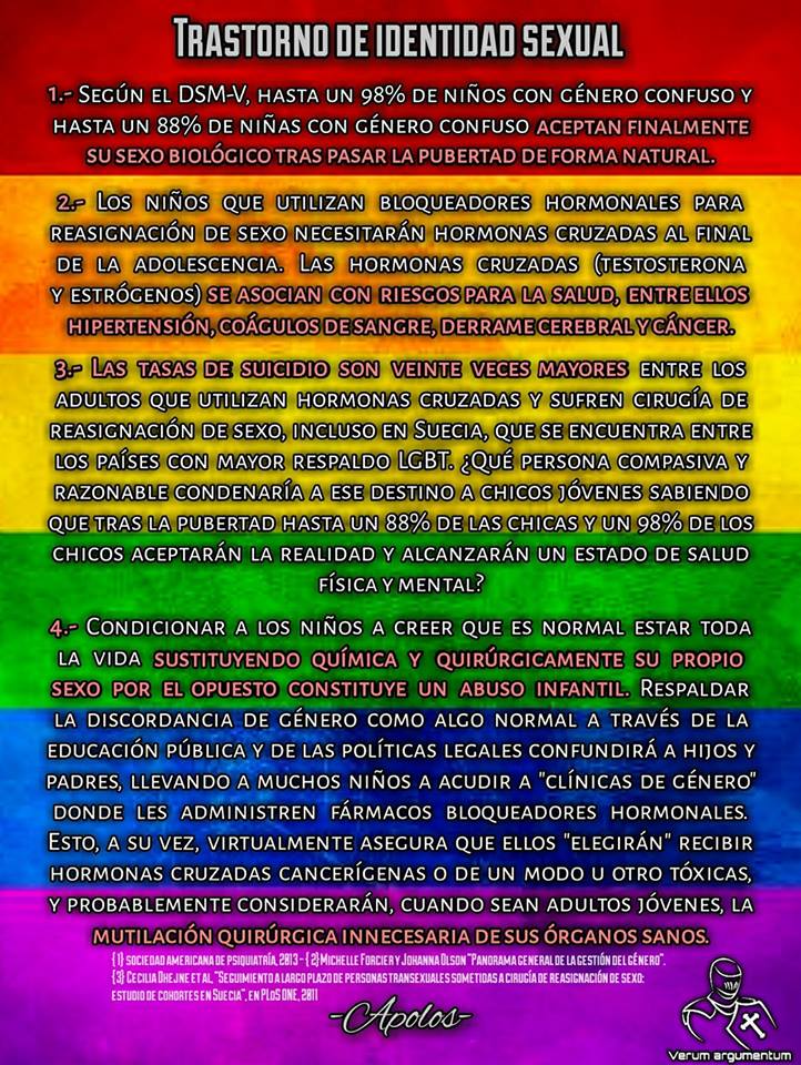 ¿No sera al reves? De hecho, según expertos, “La creencia de una persona de que él o ella es algo que no es constituye, en el mejor de los casos, un signo de pensamiento confuso, un problema psicológico objetivo en la mente, no en el cuerpo, y debe ser tratado como tal. La disforia de género, antes denominada trastorno de identidad de género, es un trastorno mental así reconocido en la más reciente edición del Manual diagnóstico y estadístico de los trastornos mentales (DSM-V). Las teorías psicodinámicas y de aprendizaje social sobre la disforia de género o trastorno de identidad de género nunca han sido refutadas.” – El Colegio Americano de Pediatras