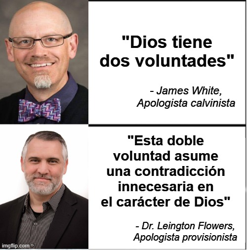 La idea calvinista de que Dios tiene dos voluntades es una doctrina absurda apoyada por muchos calvinistas como John Pipper y James White pero que no tiene fundamento histórico ni bíblico pues según esta creencia Dios quiere algo, pero luego decreta lo opuesto a lo que Él quiere. A una voluntad llaman decretiva lo cual quiere decir que Dios decreta u ordenó todo lo que sucede (incluyendo lo malo) en secreto hasta que ocurre y la otra es revelada (prescriptiva) como no robar, no mentir, no matar y otros mandamientos. Sin embargo, nada de esto tiene sentido pues es como si secretamente Dios mismo se opusiera contra su propia voluntad o como si tuviera dos voluntades separadas y contradictorias. Sin olvidar que tener una doble voluntad o doble mente contradice su propia Palabra en Santiago 1:8 y 1 Reyes 18:21. Por ejemplo, tienen un dios que dice, “No asesinarás” y por otro lado tienes a ese mismo dios decretando la matanza de su propio Hijo, Jesús (dos voluntades) o ¿qué pensarías de alguien que dice que odia los sacrificios humanos, pero hace (decreta) que ocurra? Muchos llamarían esa contradicción psicológica como esquizofrenia, sadismo y mentira. En otras palabras, tienen un dios que dice que no hagas esto, pero ha decretado que lo hagas.
